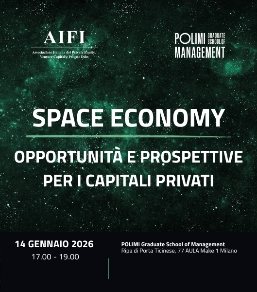 Il 14 gennaio 2026, dalle ore 17.00 alle ore 19.00 presso al Polimi Graduate School Management (Ripa di Porta Ticinese 77, Aula Make 1, Milano), si terrà l’evento di presentazione del Quaderno AIFI n.58 in tema di “Space Economy. Opportunità e prospettive per i capitali privati”, organizzato in collaborazione con Polimi Graduate School Management.