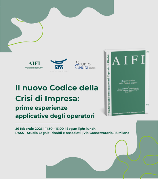 È stato presentato, nella sede milanese di RASS - Studio Legale Rinaldi e Associati, ‘Il nuovo Codice della Crisi d’Impresa’ per la collana ‘Quaderni sull’Investimento nel Capitale di Rischio’ che AIFI, l’Associazione Italiana del Private Equity, Venture Capital e Private Debt, ha realizzato per fornire agli operatori del settore un agevole strumento di consultazione.