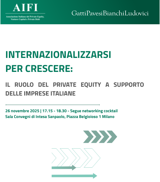 Il 26 novembre 2025, dalle ore 17.15 alle ore 18.30 presso la Sala Convegni di Intesa Sanpaolo (Piazza Belgioioso 1, Milano), si è tenuto l’evento di presentazione della ricerca “Internazionalizzarsi per crescere: il ruolo del private equity a supporto delle imprese italiane”, organizzato in collaborazione con Gatti Pavesi Bianchi Ludovici.